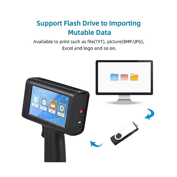 ▶【Intelligent Inkjet Printer】: It can print numbers, barcodes, logos, brands, words, data and labels on cardboard, cables, plastic, pipes, electronic components and aluminum materials, etc. Ideal for manufacturing, retail, warehouse, logistics and design workshops, T-shirt DIY studio.