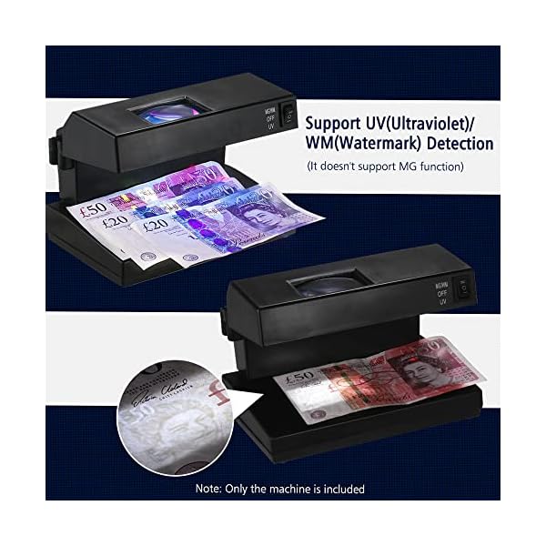 【Detection Functions】:Support UV(Ultraviolet)/WM(Watermark) detection, powerful to help you detect forged and counterfeit banknotes.(It doesn’t support MG function)
