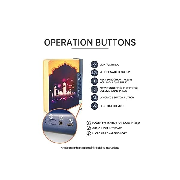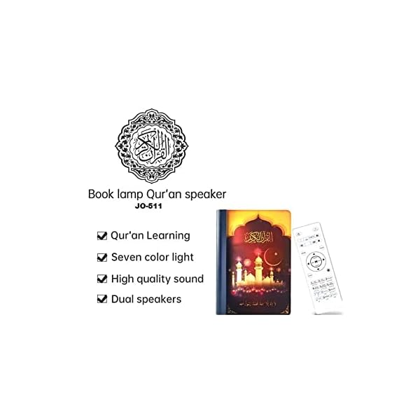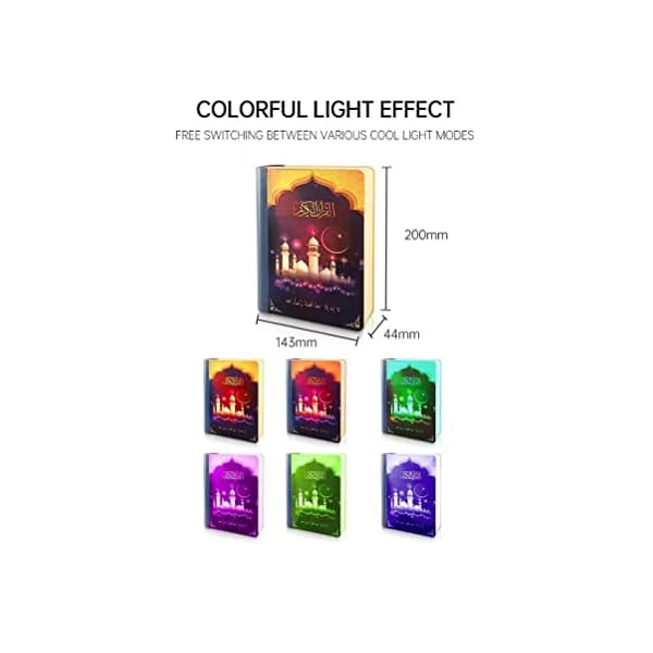 Playing any Quran surah by pressing button on remote. Playing Quran audio word by word. Playing Quran translation. Choose your native language to understand the meaning of the Quran, Easy for learning Quran by this way. This LED light speaker with 7 colourful light display, for your choice presents different musical atmosphere. It keeps the lamp cool even after prolonged use and gives soft light that will not harm your eyes. It is a lamp with full recitation of the Noble Quran, using remote control to select Quranic audio and listen to Quran with high quality voice.Bluetooth wireless connection, up to 15 meters Bluetooth distance. This bluetooth speaker can be a great choice of gift for friends, Christmas Day , Easter Day, Thanksgiving Day, anniversary, Mothers Day , Fathers Day , Birthday , Halloween, wedding, and so on. Rechargeable wireless Bluetooth speaker, super long work and lighting. Easy charging via USB cable with 1-2 hours charging time. Rechargeable battery can be used in your computer/mobile device or charged.