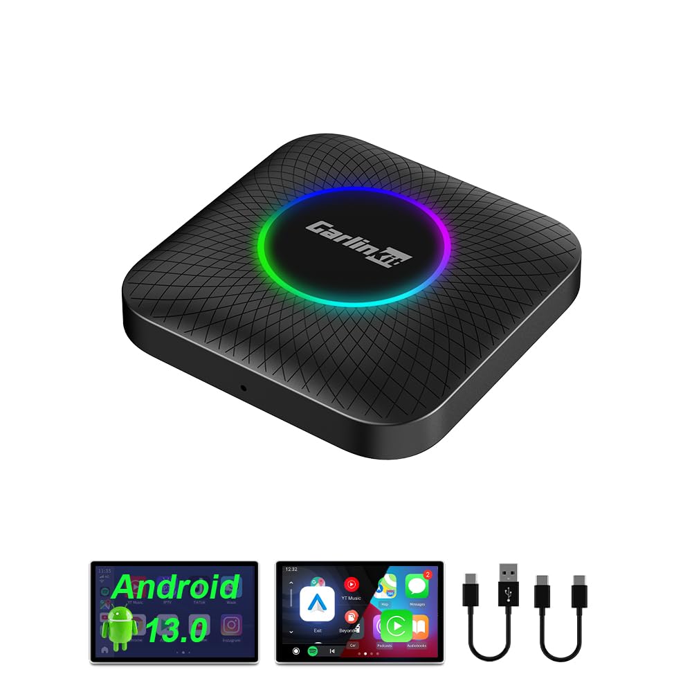 CarlinKit CarPlay Ai Box Android 13.0 with LED Light for Car with Wired CarPlay and Touchscreen,Bulit-in 4G Net,8-Core 8+128G,GPS,YouTube,Netflix,Google Play,Wired to Wireless CarPlay and Android Auto