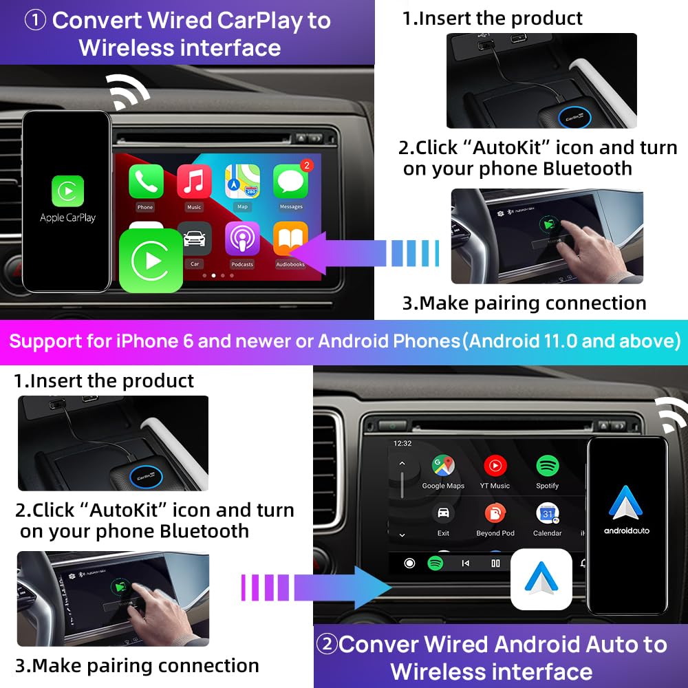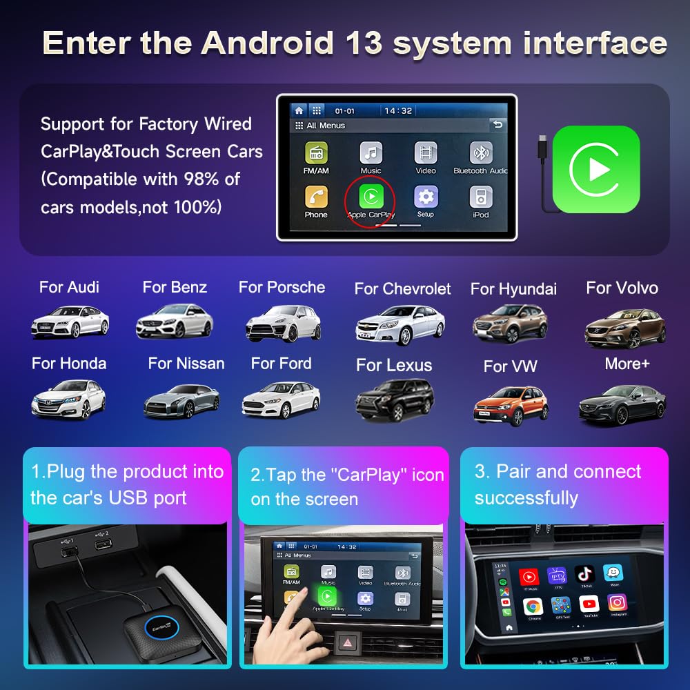 - 【OEM Apple CarPlay Upgrade】Your car system must be equipped with factory wired CarPlay and touch screen, which is a very important condition of use!Support 98% of the car models. (Not compatible with: B-MW Series, N-issan).Suitable for iPhone iOS 10, Android 11 phones